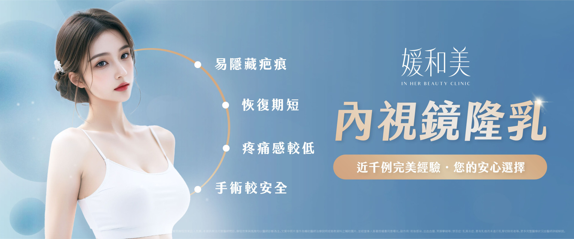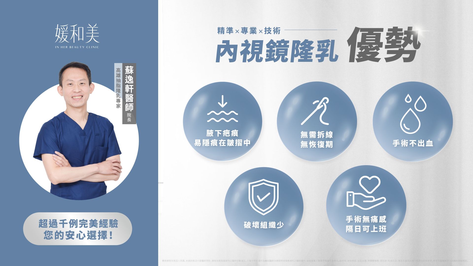 因此請選擇媛和美整形外科診所,擁有20多年整形外科手術經驗的蘇逸軒院長,精研內視鏡隆乳手術,使術中幾乎不見血,同時縮短手術時間,並提供醫療中心等級的無菌正壓空調系統(HEPA),降低手術感染風險;並術後由貼心與專業醫護人員給予最細緻的衛教與照護。