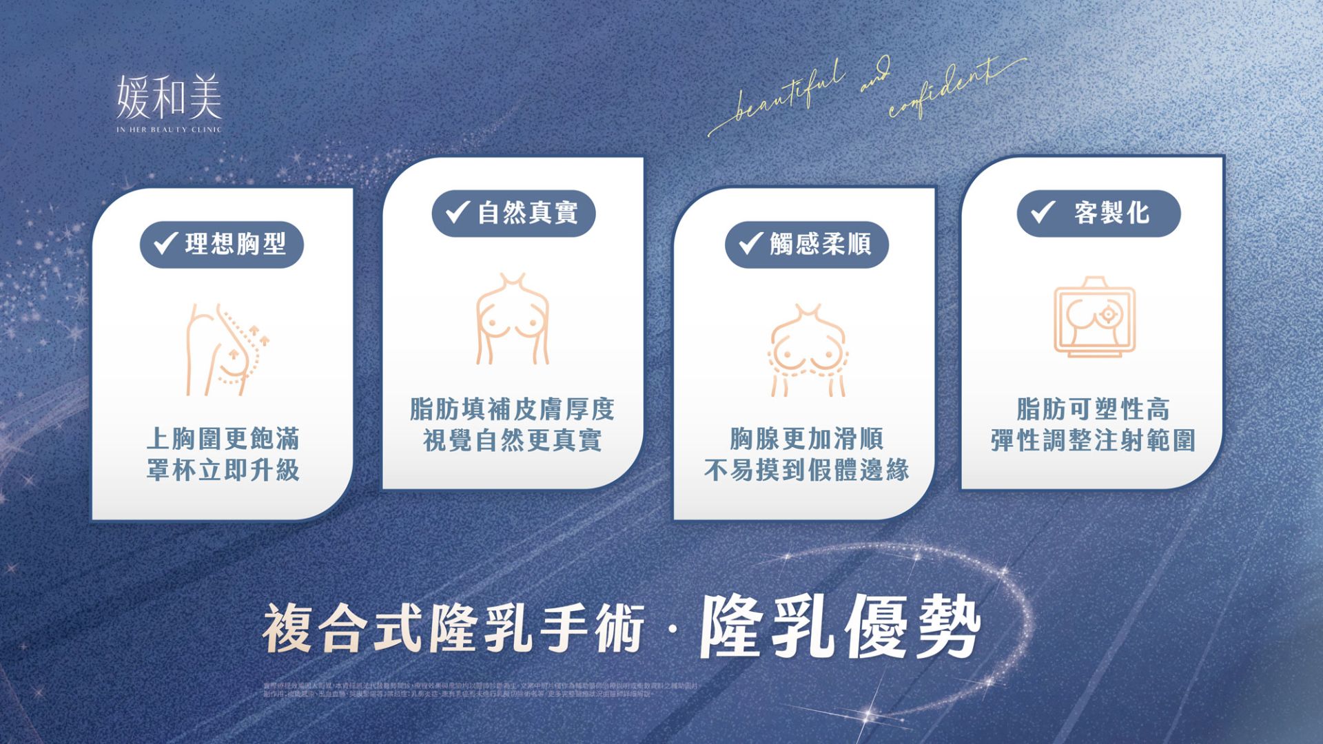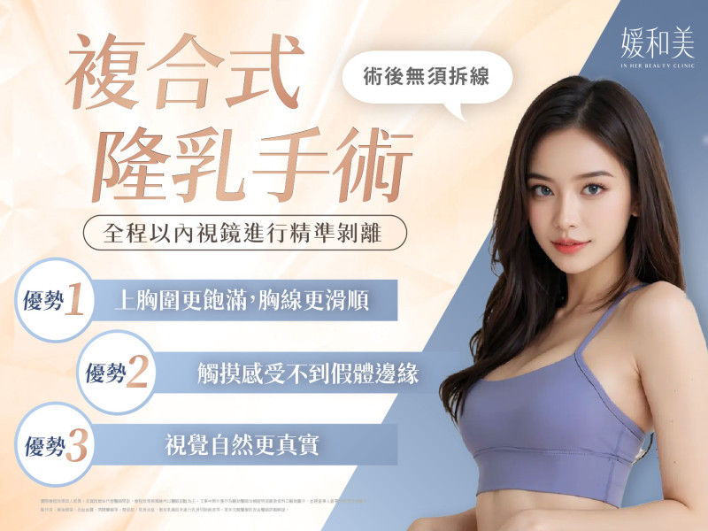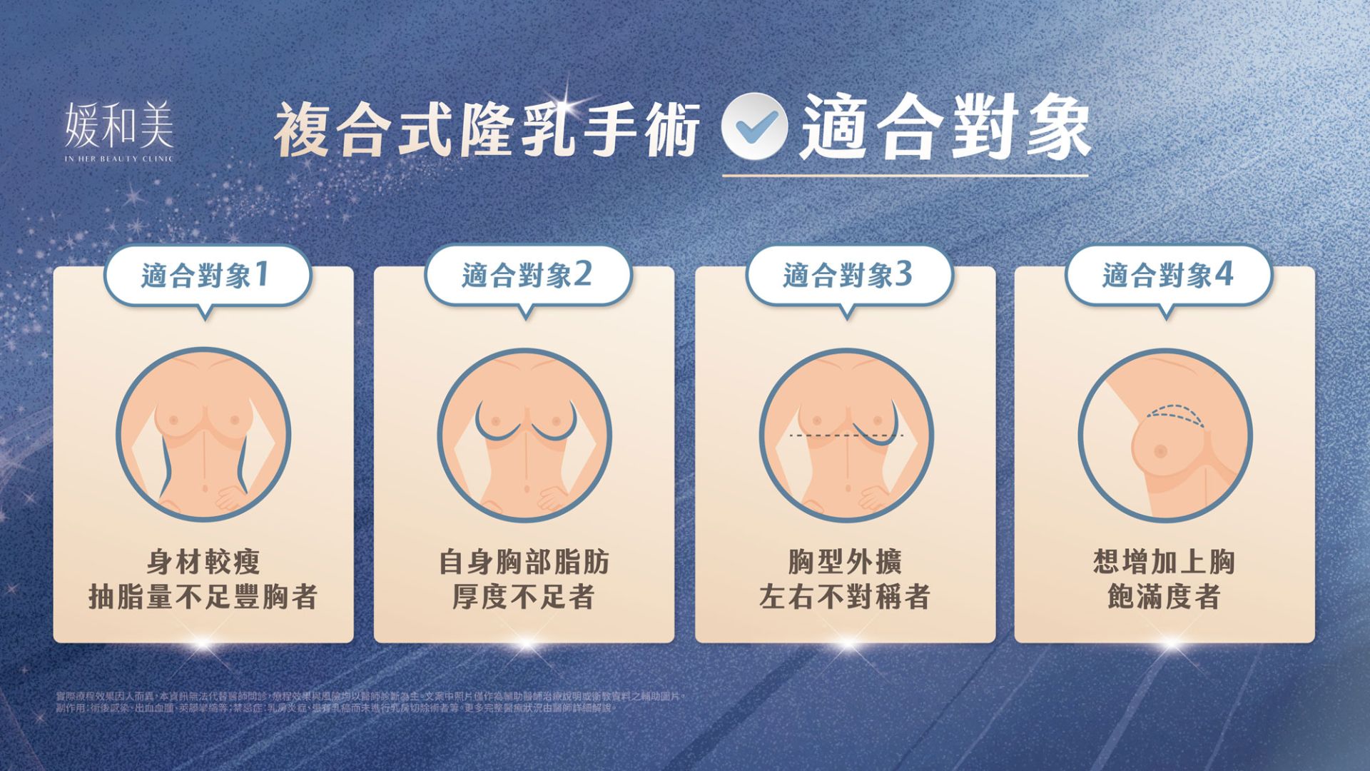 亞洲女性的胸型上半部偏無肉、不豐滿,與西方人胸形迥異,雙面複合式隆乳適合亞洲女性,特別是胸部B罩杯以下者。此方式可使上胸更飽滿,胸形呈現自然的水滴形,不會太假。活動時也可減少矽膠跳動而「穿幫」,術後的觸感也更加柔軟自然。或是害怕摸起來有邊緣感者,也適合此項手術。