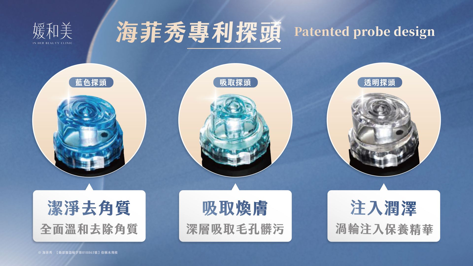 HydraFacial® 海菲秀(衛部醫器輸字第018863號)來自美國,是非常溫和、非侵入式、非雷射激光、非針筒注射之活膚煥膚美容療程,海菲秀突破了傳統水晶磨皮、鑽石微雕、果酸煥膚的限制,可徹底清潔毛孔油脂、去除表皮老廢角質、無痛清除黑頭粉刺、同時達到深層滋潤保濕的煥膚新法;使用獨特專利螺旋頭HydroPeel® Tips,搭配多種具特定成份功效之精華萃取液,達到換膚的效果。