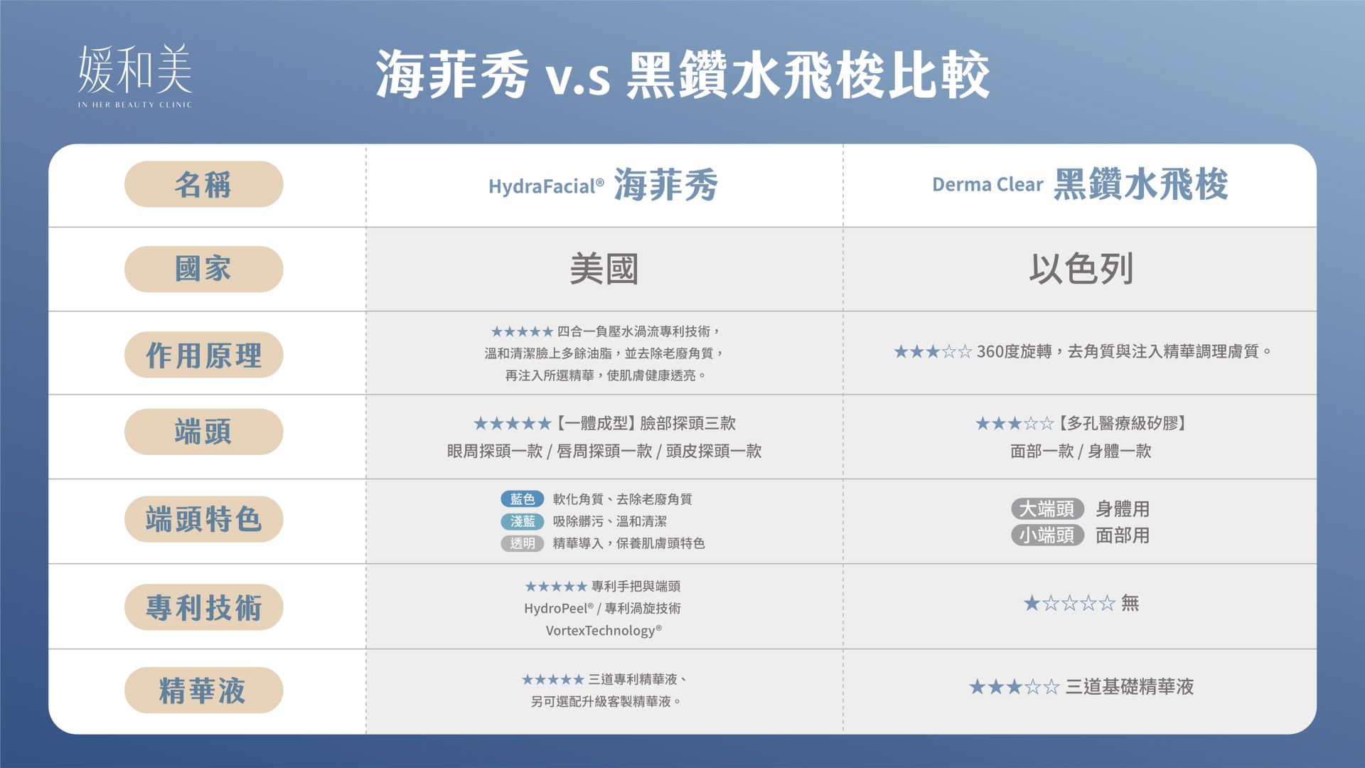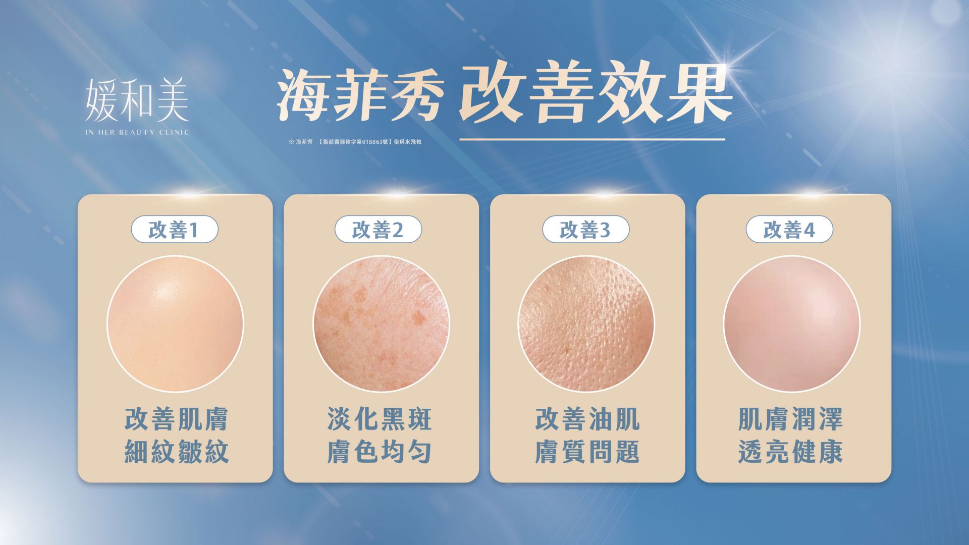 有醫美界Dyson吸塵器的美國原廠海菲秀(俗稱水飛梭)成為現在眾多人喜愛的醫美項目。溫和無痛地清除臉上堆積的髒污與老廢角質,維持透亮、健康的良好肌膚狀況。讓肌膚在保濕力充足的情況下,改善膚質上的微小瑕疵與多樣性肌膚問題。代謝老廢角質、肌膚補水保濕、清潔粉刺毛孔、改善暗沉膚色不均、清除髒汙。徹底清潔毛孔油脂雜質,去除表皮老化角質皮屑,無痛拔除黑頭粉刺,並深層滋潤保濕的煥膚法。